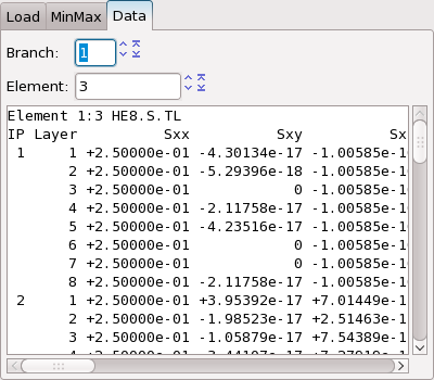 GradientPackageobject allows for listing all layers and component names and for retrieving the values for all sampling points inside the element for thatField:>>> g.layers [1, 2, 3, 4, 5, 6, 7, 8] >>> g.components ['Sxx', 'Sxy', 'Sxz', 'Syy', 'Syz', 'Szz', 'S1', 'S2', 'S3', 'SD1', 'SD2', 'SD3', 'hydrostatic', 'max-shear', 'max-shear-2d', 'max-shear-upper', 'octahedral', 'von-Mises', 'von-Mises-2d'] >>> g.get_gradients(layer=1, compname='Sxx') (0.25, 0.25, 0.25, 0.25, 0.25, 0.25, 0.25, 0.25)
