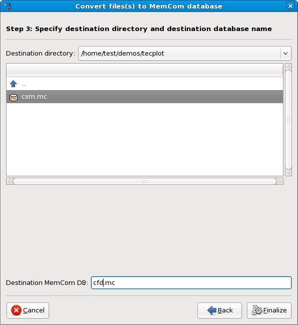 On the third page, a target MemCom database is selected. This is the database which will be created and initialized with the mesh and solution field data from the TecPlot file(s).