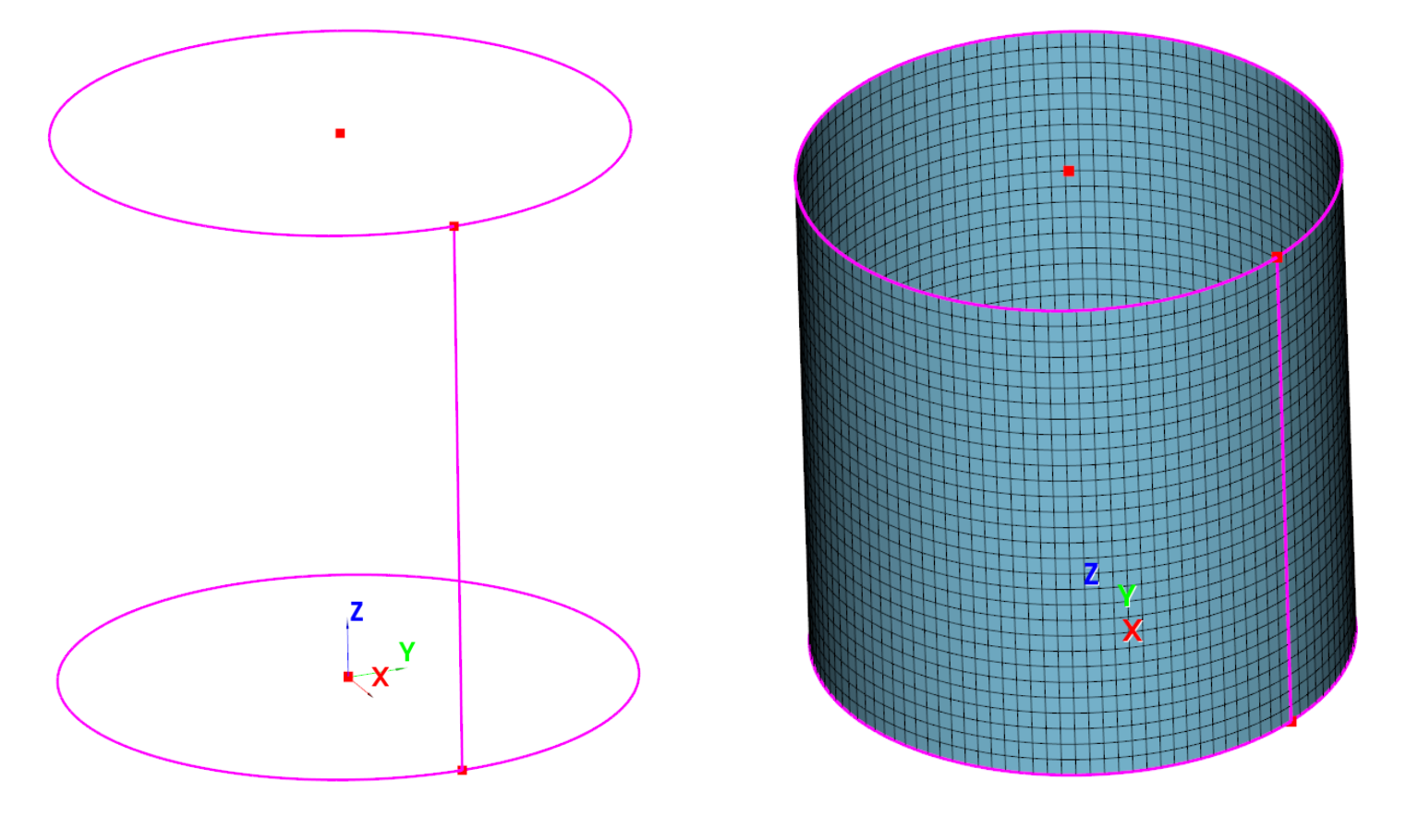 The first part of the test concerns linear buckling. The cylinder is generated with the Minimodeler by defining the lower and upper circle of the cylinder. Meshing is automatic: The figure below shows the Minimodeler Brep definition of the cylinder and the meshed cylinder.